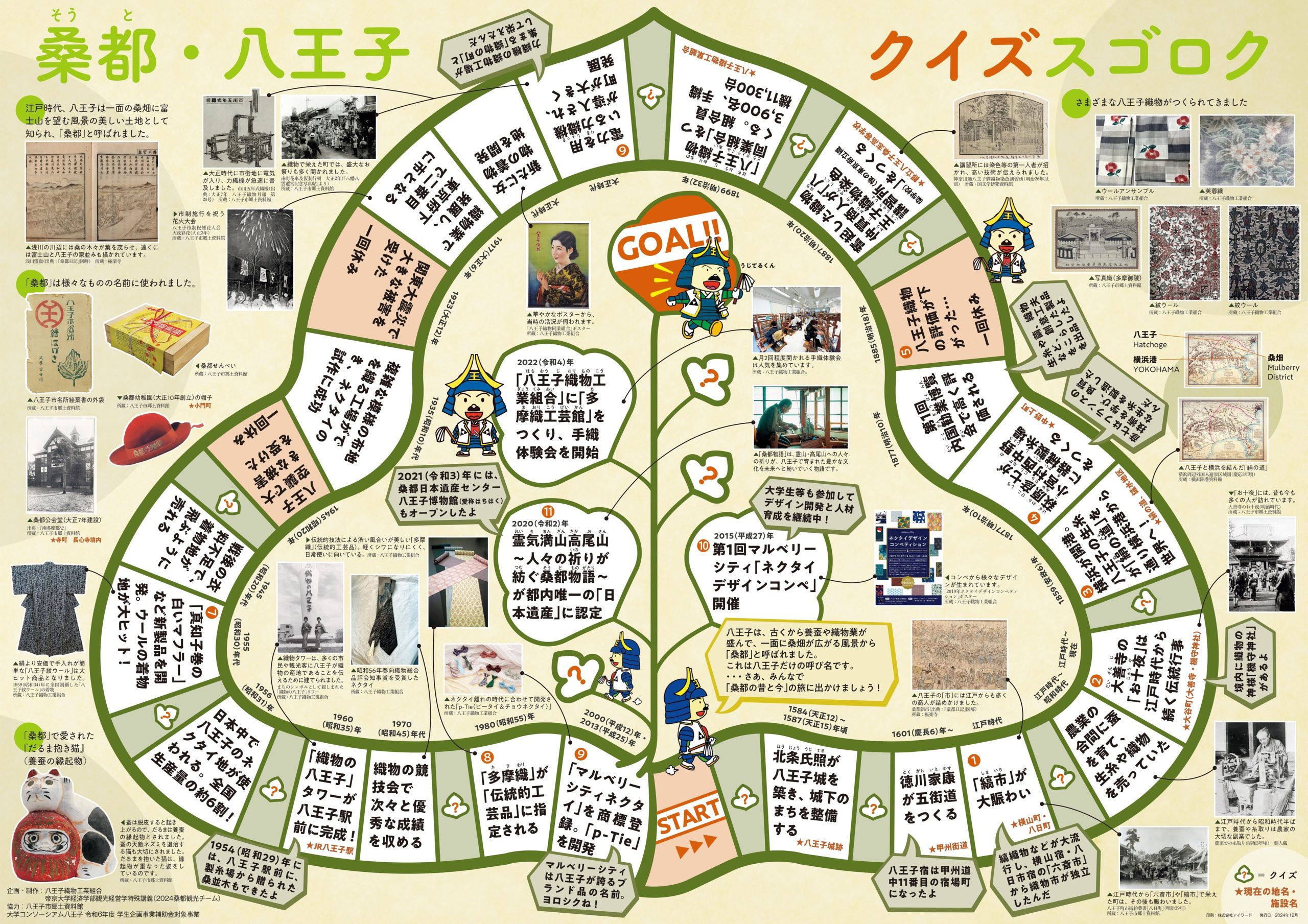 令和6年度に、八王子織物工業組合、帝京大学経済学部観光経営学科が連携して制作・発売した、遊びながら八王子の日本遺産を知ることのできるスゴロクです。